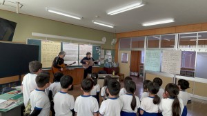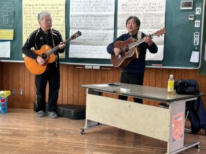 教室に入ると小学2年生たちのキラキラ笑顔がお待ちかね。大声援と拍手でお招きいただいた。紹介ののちH先生のギターが奏でられ壁に貼られた「新しい朝」「南風の頃」「ふる里に春が来た」「星の旅人」「別れのワルツ」が次々と披露された。子供たちの穢れなき健気な純な歌声に感動の嵐である。時間よ止まってくれと言いたくなるほど貴重な体験。先の歌たちの今の姿、未来の希望の姿があっという間に過ぎていく。
